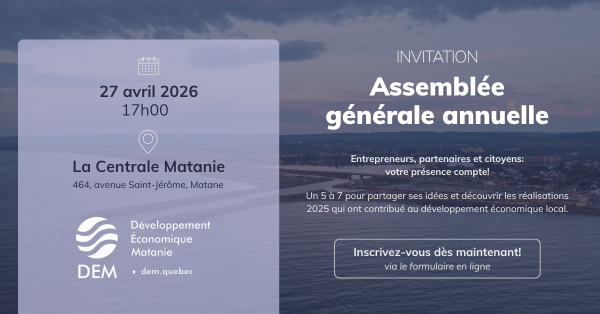 Développement Économique Matanie tiendra son assemblée générale annuelle le lundi 27 avril 2026, à 17h, à La Centrale Matanie, 464, avenue Saint-Jérôme, à Matane.